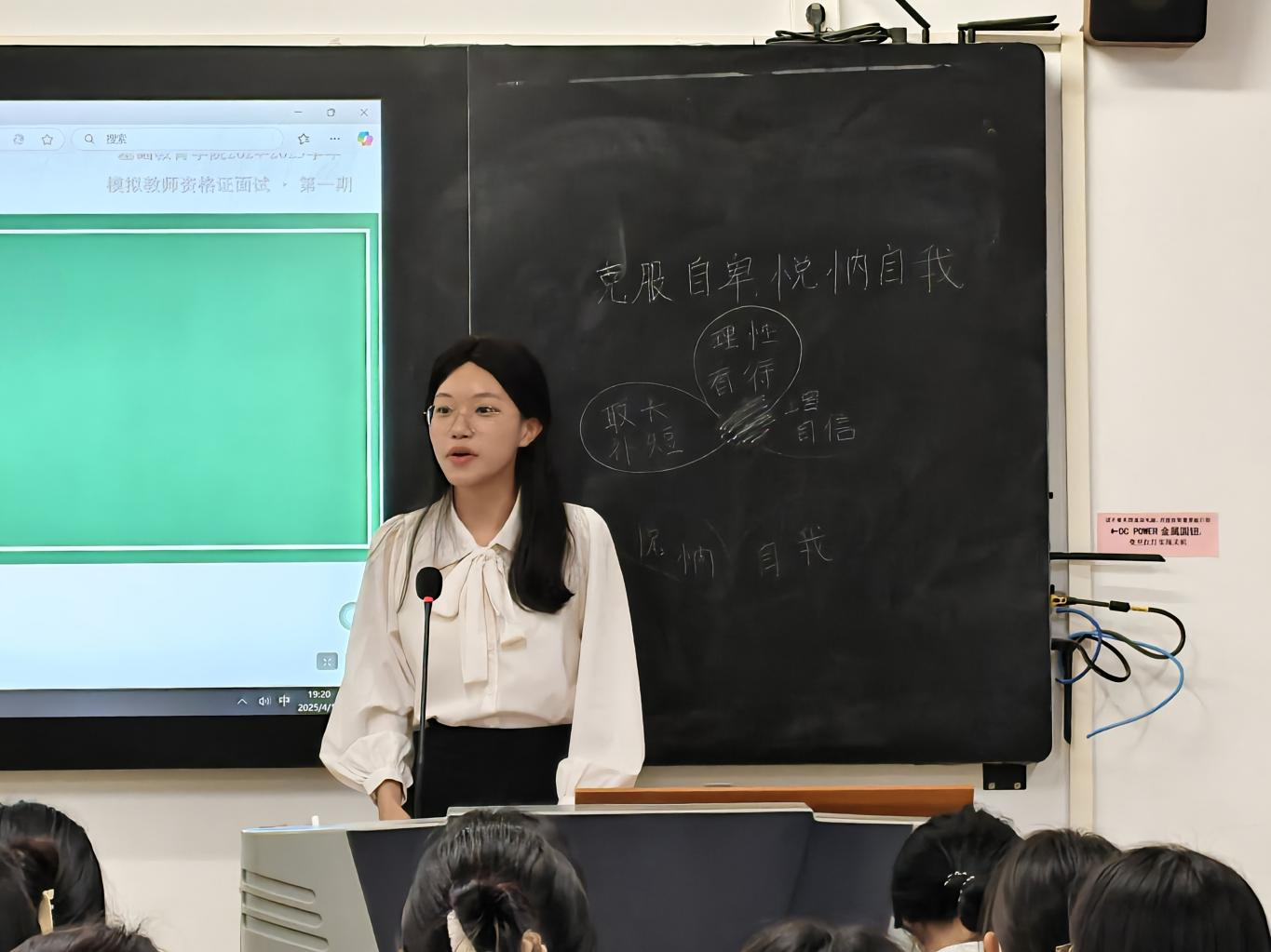 余冰雁抽到《克服自卑,悦纳自我》这一题,她将板书设计成一朵花的形式,简洁且直观,借以告诉学生:我们每个人都如花一般美丽,不必自卑,悦纳自我。在试讲中,余同学教姿教态自然大方,通过讲授法、问答法、小组探究法等多种教学方法,讲解要点,层次清晰。