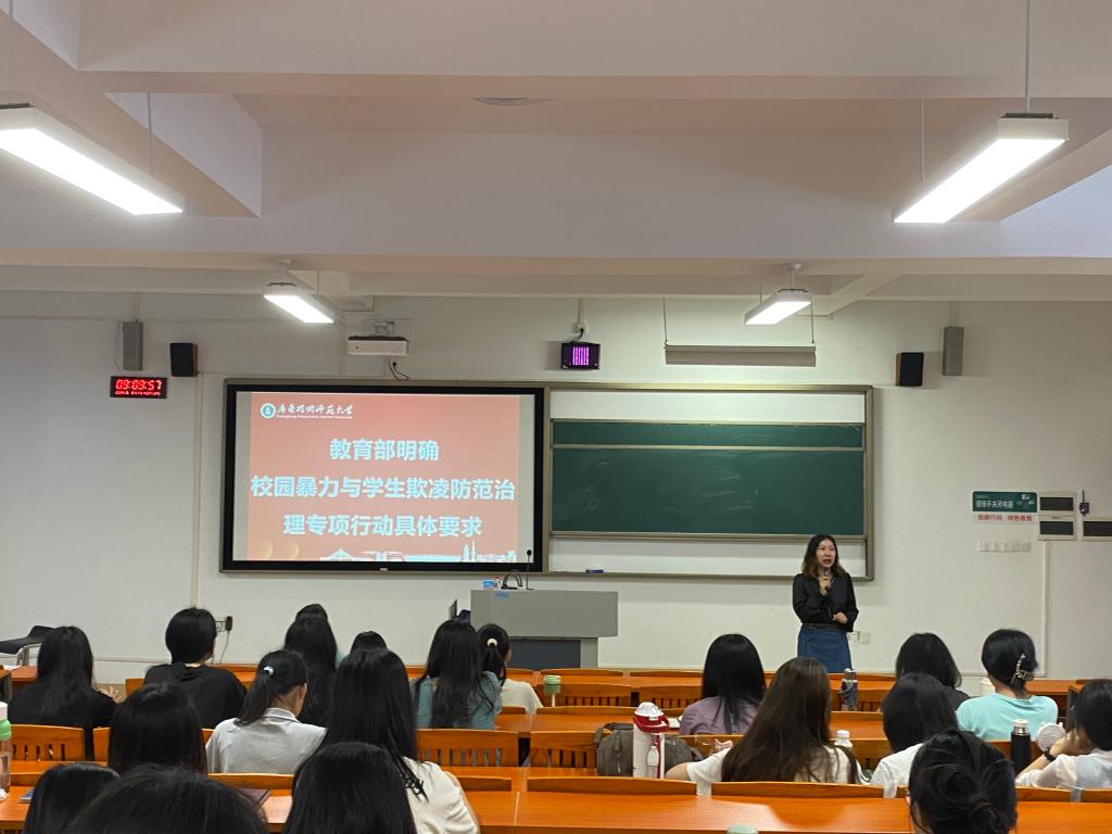 为了进一步营造良好学风、班风、院风,助力和谐校园建设,基础教育学院于6月3日9:00于唯实楼422教室开展“花儿与少年,成长与安全”主题班会,学院专职辅导员李晓敏带领同学们一起学习专项行动具体要求,并开展欺凌防治专题培训,旨在帮助同学们提升防护意识,系牢安全纽带,实现助人自助。