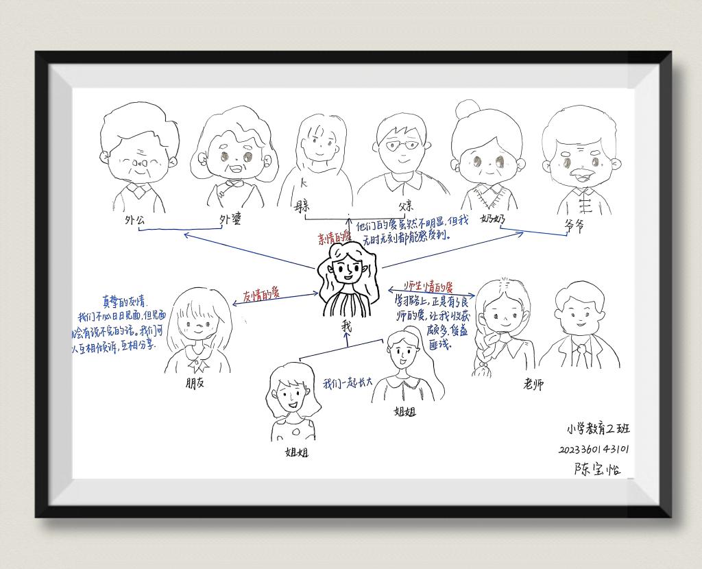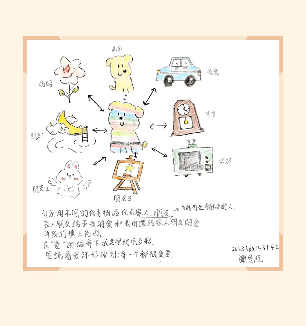 本次活动鼓励同学们以自己为“C位”,绘制一幅代表个人与家庭、朋友、社会等各个关系网络的爱的链接图,并用文字阐述其排列的原因。同学们通过纸笔,自由涂色,不仅展现了各自的想象力与创造力,更在文字中深入探讨了生命的意义、家庭的内涵以及爱的价值。
