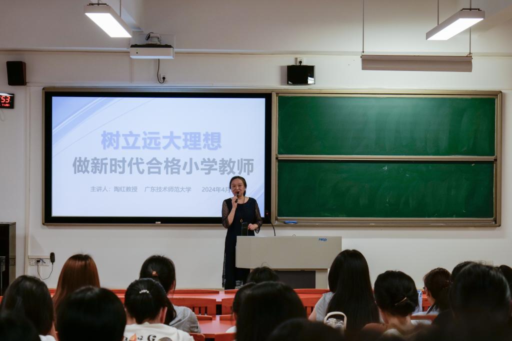 为引导同学们明确教育理想,深刻理解新时代小学教师的职责,4月15日晚,基础教育学院院长陶红教授于河源校区唯实楼423教室为同学们讲授思政课,课程主题为树立远大理想,做新时代合格小学教师。基础教育学院2023级本科生参加此次思政课。