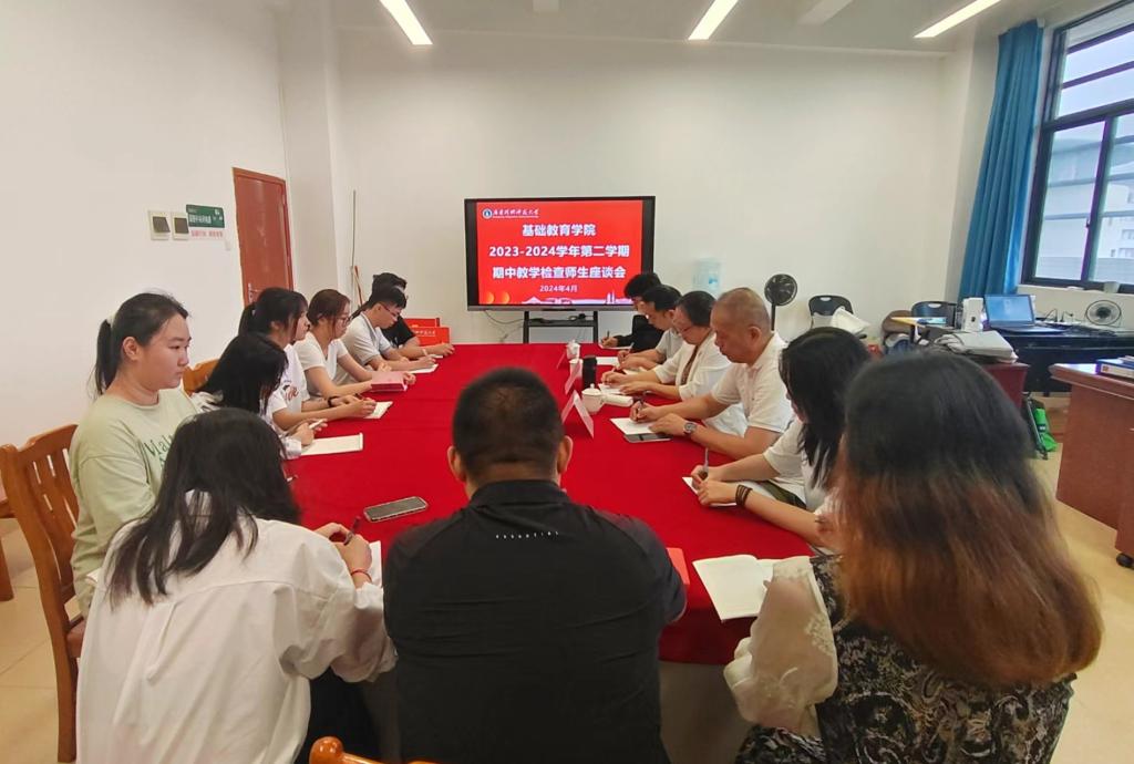 为持续加强本科教学过程监控与管理,进一步提升育人实效,基础教育学院于4月22日下午4:00在厚德楼520开展2023-2024学年第二学期期中教学检查师生座谈会。学院院长陶红教授,河源校区管委会副主任李冲出席会议,学院专职辅导员、专任教师、教务员、实验员和学生代表参加会议。