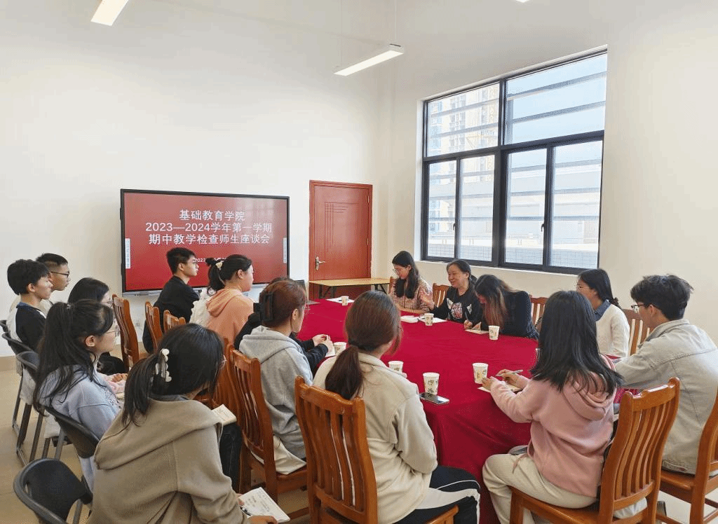 为加强教学管理和教风学风建设,深入了解掌握“教”与“学”情况,征询和听取广大师生的意见和建议,提高课堂教学质量,2023年11月26日,基础教育学院召开了2023-2024学年第一学期期中教学检查师生座谈会。陶红院长、吴水爱书记、各位专任老师以及14位学生代表出席了此次会议。