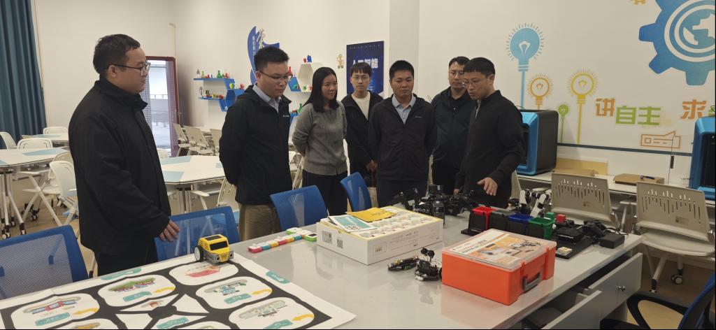 随后,广州天空科技有限公司河源分公司负责人余九龄一行应邀到访广师大河源校区基础教育学院。在吴水爱书记的陪同下,余九龄一行先后参观了无人机及模拟飞行实训室、虚拟仿真实训室、人工智能创客实训室等特色场所,全面了解学院发展定位与办学资源。听完相关介绍后,余九龄表达了强烈的合作意愿,明确表示“公司将主动融入广师大纵向帮扶工作,与这位‘好邻居’深化合作、携手共赢”。现场,双方还达成初步共识,企业将通过资金赞助、无人机设备支持及专业人员现场助力等方式,参与学院近期举办的校运会活动。