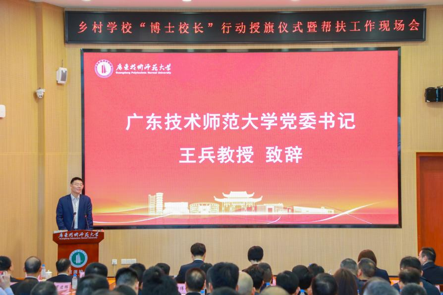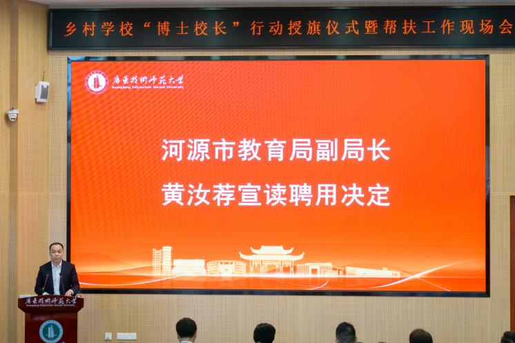 在授旗环节,河源市委常委、宣传部部长谢春艳为市直学校和7个区县的“博士校长”团队逐一授旗,标志着“博士校长”正式进驻乡村学校,开启教育帮扶新征程。