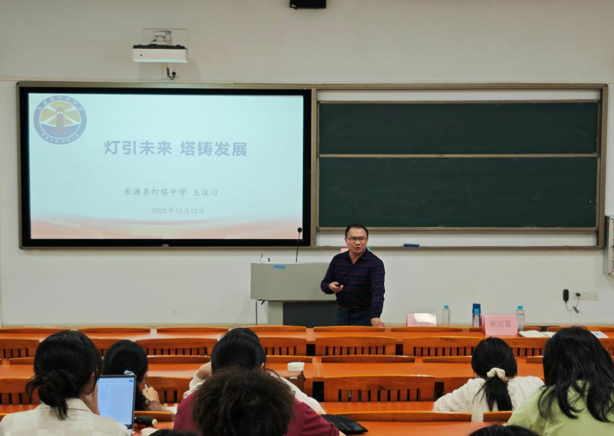 在热烈的掌声中,王汉习校长率先上台,以“灯引未来,塔铸发展”为主题,分享了自己任职灯塔中学的治校经历。他详细介绍了学校的办学理念、师生基本情况与历史发展脉络,重点提及这所粤东西北农村学校的足球特色办学方向。围绕学生心理健康教育,王校长介绍了学校设立专业心理咨询室的实践举措,展现了学校在扎根乡土、培育心怀梦想、意志坚强的“灯塔少年”过程中所做的努力。同时,他直面粤东西北农村学校发展面临的现实困境,引发了在场师范生对乡村教育现状的关注与对未来教育责任的深刻思考。在饱含热情的分享中,师生们既感受到了灯塔中学的独特魅力,也体会到了一位乡村校长肩上的责任与温度。