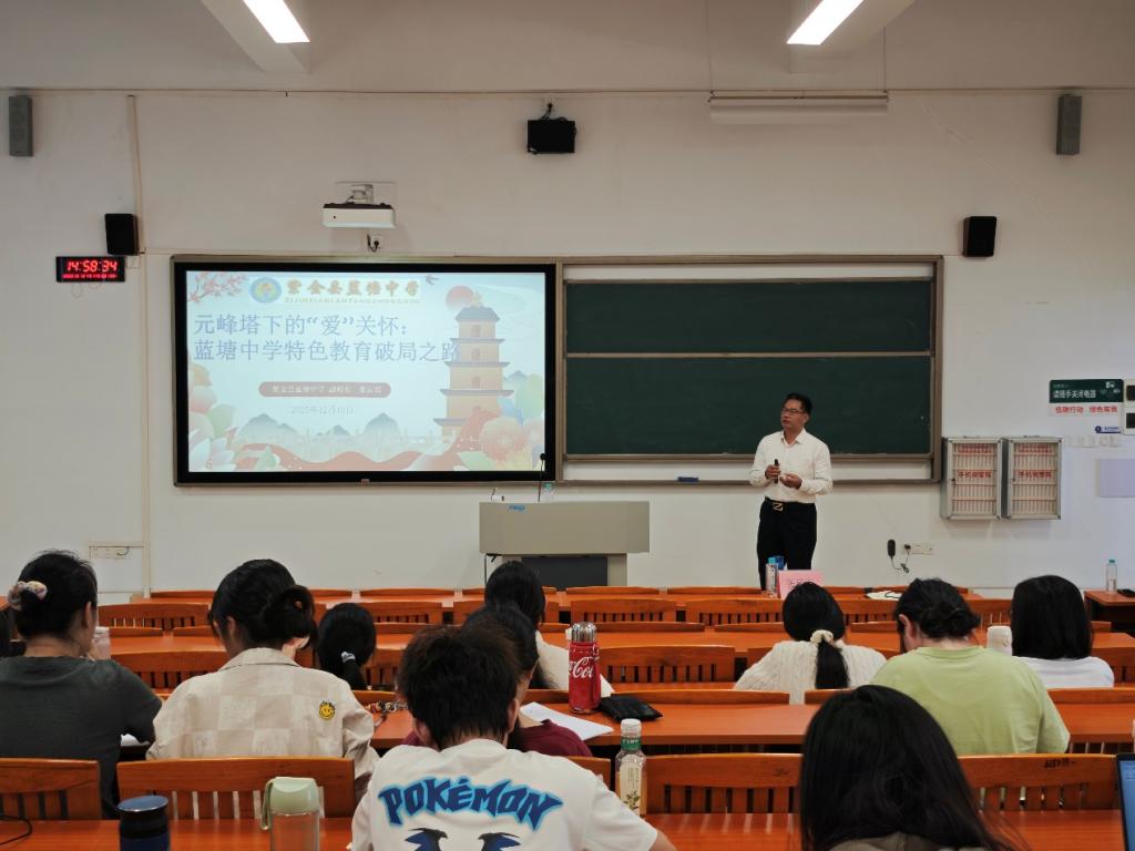 随后,张运富副校长以自身治校实践为切入点展开分享。他指出,蓝塘中学立足粤东西北乡土实际,以本土文化为根基探索特色教育新路径。学校从改造校门口积水、升级心理辅导室等关乎师生切身利益的“小事”入手,打造“蓝塘客家文化德育课”,开设“蓝塘暖心屋”,设立“蓝塘安全宣传员”,让学生在浓郁的本土文化浸润中成长。此外,学校积极挖掘乡贤资源,汇聚社会爱心力量,有效激发了学生的学习积极性。通过张副校长的分享,师生们深入了解到这所粤东西北乡村学校深厚的历史底蕴与办学特色。蓝塘中学的一系列实践,实现了学生安全满意度、德育兴趣度、心理辅导信任度的大幅提升,为粤东西北地区乡村教育发展提供了可复制、可推广的特色模式,让教育真正扎根乡土、温暖人心。