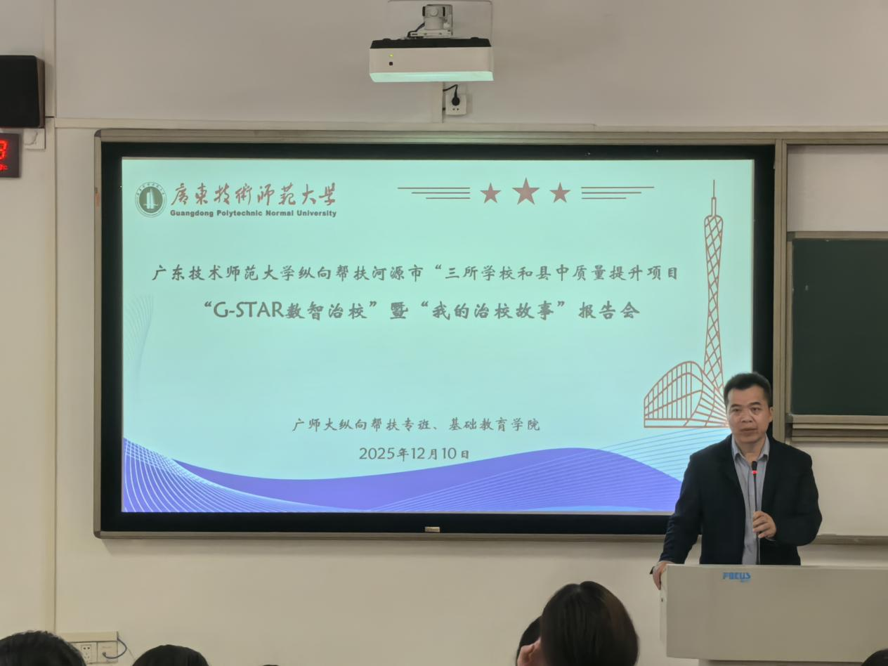 为深化小学教育专业学生对课程改革的理解,推动教育理论与一线实践相结合,2025年12月10日,永利3044集团官网基础教育学院杨定玉教授在唯实楼109教室组织开展《小学课程与教学改革》专题讲座暨校长经验分享会。2024级小学教育专业全体本科生到场学习。本次讲座围绕我校纵向帮扶河源市三所学校与县中质量提升项目“G-STAR数智治校”系列内容展开,特邀河源高新区实验学校钟天敏校长与龙川县麻布岗中学黄龙耀校长,分别就学校治理与教育实践作专题报告。