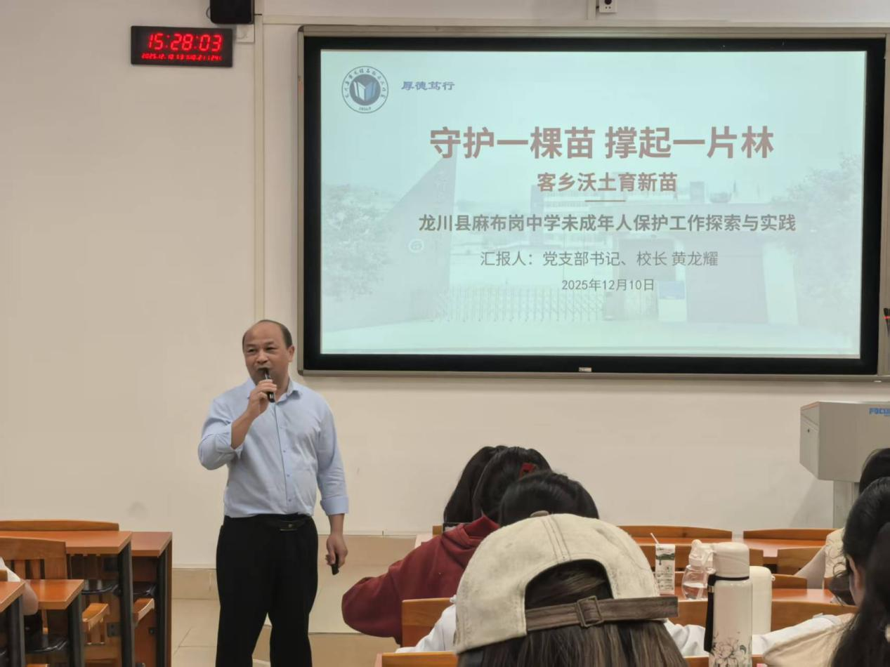 随后,黄龙耀校长以“守护一棵苗,撑起一片林——麻布岗中学未成年人保护工作的探索与实践”为题进行分享。他分析了当前中学生因家庭与心理因素可能导致的行为与情绪问题,强调学校应坚持“立德树人”,通过德育引导、心理支持、劳动教育等多途径促进学生全面成长。黄校长详细介绍了学校通过调研走访、凝聚师资共识而实施的“十抓实十提升”精细化管理机制,为未成年人保护工作筑牢坚实基础。