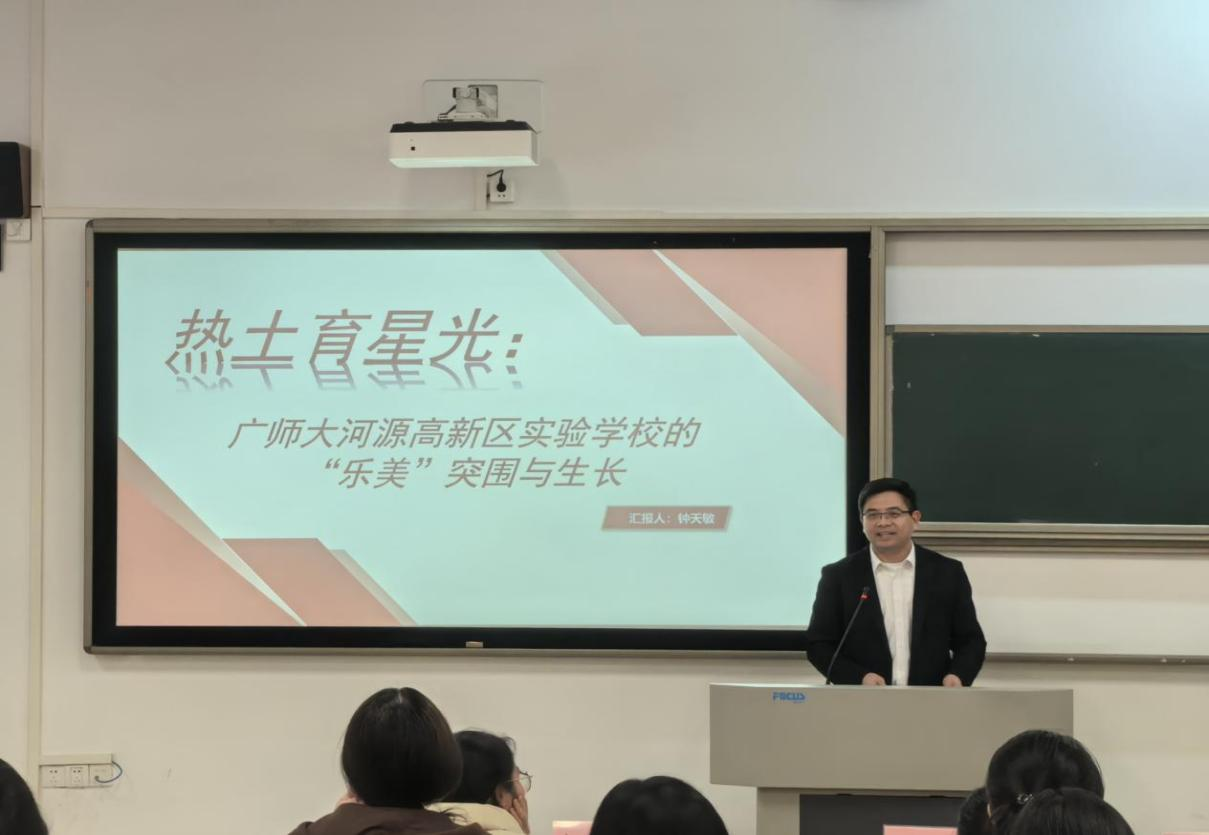 钟天敏校长以“热土育星光:广师大河源高新区实验学校‘乐美’突围与成长”为题,系统阐述了学校在育人过程中的实践与思考。他着重介绍了校服管理对塑造校园风气、提振学生精神的重要作用,并分享了学校在“五育融合”方面的校本探索,涵盖跨学科协作、VR体验、桥梁承重实验、植物拓染等多样化课程活动。钟校长强调,教育应坚守“安全与温饱优先”的底线,尤其关注务工人员子女的生活与学习保障,推动教育内容贴近学生真实生活,增强学习的情感认同与实际价值。同时,他也指出当前家校共育中家长教育能力不足等现实挑战,呼吁构建扎根社区、协同育人的本土化教育体系。