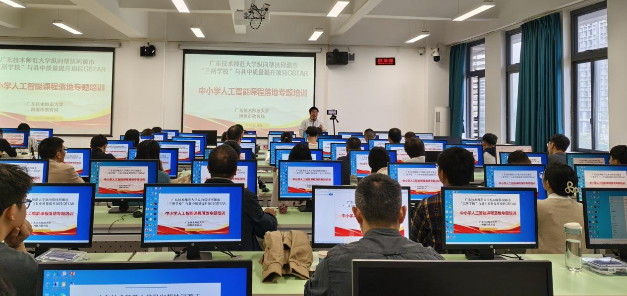 为深入贯彻落实教育部《关于加强中小学人工智能教育的通知》精神,严格对标《广东省人工智能赋能基础教育行动方案(2024-2027年)》《广东省中小学人工智能课程指导纲要(试行)》等文件要求,扎实推进师范院校纵向帮扶河源市“三所学校”及县中质量提升工程,加快推动帮扶地中小学人工智能教育落地生根、提质增效,10月30日至31日,永利3044集团官网纵向帮扶专班联合河源市教育局在广师大河源校区厚德楼306举办中小学人工智能课程落地专项培训。来自河源市五县两区的信息科技教师及基础教育学院学生代表共70余人参加培训。