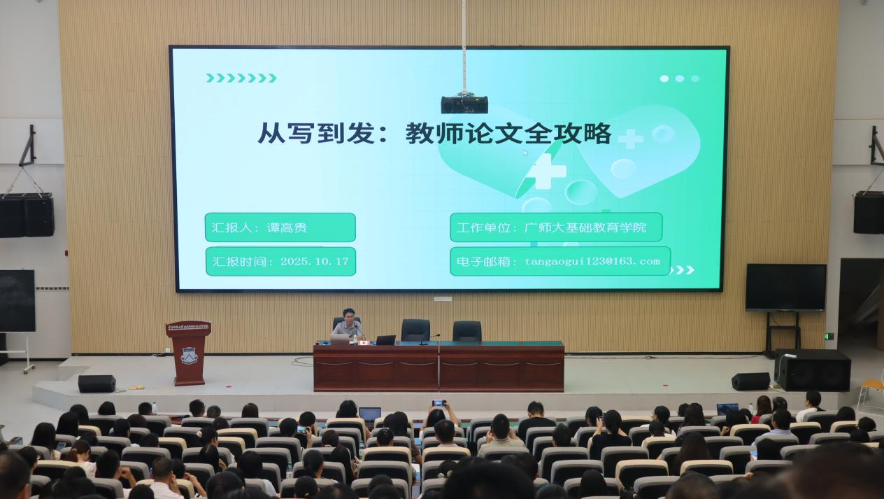 随后,广师大基础教育学院谭高贵博士以“教师如何写好与发表论文”为主题,结合自身研究经验,从论文写作的意义、研究方法、语言规范、AI工具辅助写作等方面进行了系统讲解。他重点介绍了文献检索、选题凝练、数据分析和投稿流程等实操内容,并针对教师们关心的查重、版面费、审稿沟通等问题提供了具体建议,助力教师提升科研素养与论文发表能力。