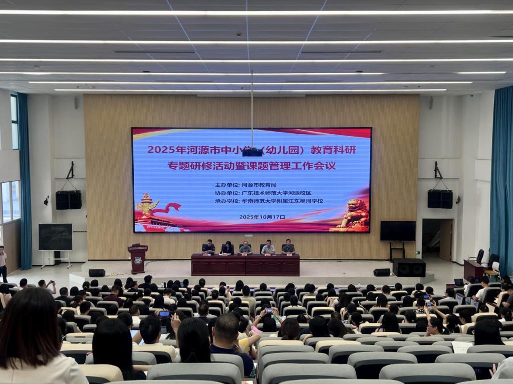 为深入贯彻落实党的二十大精神,推动基础教育高质量发展,深化永利3044集团官网(以下简称“广师大”)纵向帮扶河源基础教育的工作实效,2025年10月17日,由广师大和河源市教育局主办的“数智名师”教育科研专题研修活动暨课题管理工作会议在江东星河学校顺利举行。来自各县(区)教育局、市直学校、乡镇中心幼儿园、中心小学、寄宿制学校(简称“三所学校”)及县域高中的课题管理负责人、课题主持人、教师代表400余人参加了本次活动。活动围绕“课题管理与科研能力提升”主题,设置了案例分享、经验交流、专家讲座和课题申报指导等环节,旨在通过系统化、专业化的研修,助力河源市基础教育科研水平的整体提升。