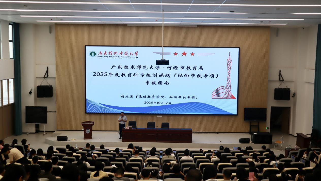培训会上,杨定玉教授进一步围绕“2025年广师大纵向帮扶专项课题申报”进行详细解读。他从政策背景、指导思想、申报单位与流程、课题类别与研究内容等方面展开说明,强调本次课题突出“精准、实效、融合、生成”,鼓励教师立足河源教育实际,以调研报告、工作方案等实践成果为导向,“将论文写在河源教育大地上”。