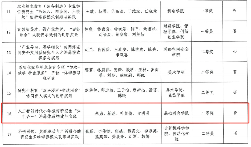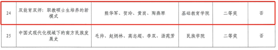 近日,根据《关于开展全省学校优秀教学成果奖评审工作的通知》(粤教人函〔2025〕23号)及《关于开展2025年校级研究生教学成果奖申报及评审工作的通知》的有关要求,我校2025年校级研究生教学成果奖评审工作已圆满结束。经过教师个人申报、单位推荐、形式审查以及专家现场评审等多个环节的严格考核,基础教育学院熊华军老师和朱姝老师分别以其主持的两个优秀教学成果团队,双双荣获2025年校级研究生教学成果二等奖。