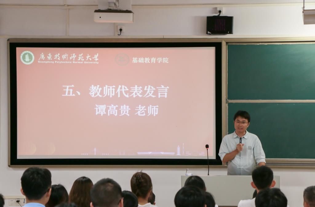 教师代表谭高贵老师结合自身教学经验,为新生开启精彩大学生活送上“小秘诀”——“坚持三个‘1’的生活节奏”,并希望新生能够将它们融入到日常的学习和生活中,让大学时光充实而有意义,健康而有活力,友谊而有温度。
