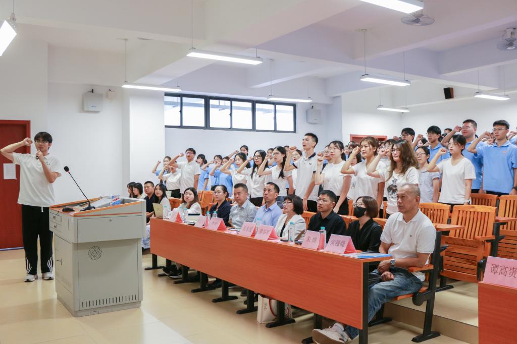 “梦在前方,路在脚下,我们都是追梦人。为第二个百年奋斗目标,为中华民族伟大复兴中国梦,我们矢志前行。不忘初心,青春永在;志在千秋,仍是少年。奋斗正当时,青春献给党!准备着,为共产主义事业奋斗!时刻准备着!请党放心,强国有我!”学院2025级全体新生在24小学教育1班周鹏同学的领誓下共同宣誓,铿锵有力的青春誓言响彻整个会场,一份爱校荣校的归属感与荣誉感已悄然驻留在2025级新生的心间。
