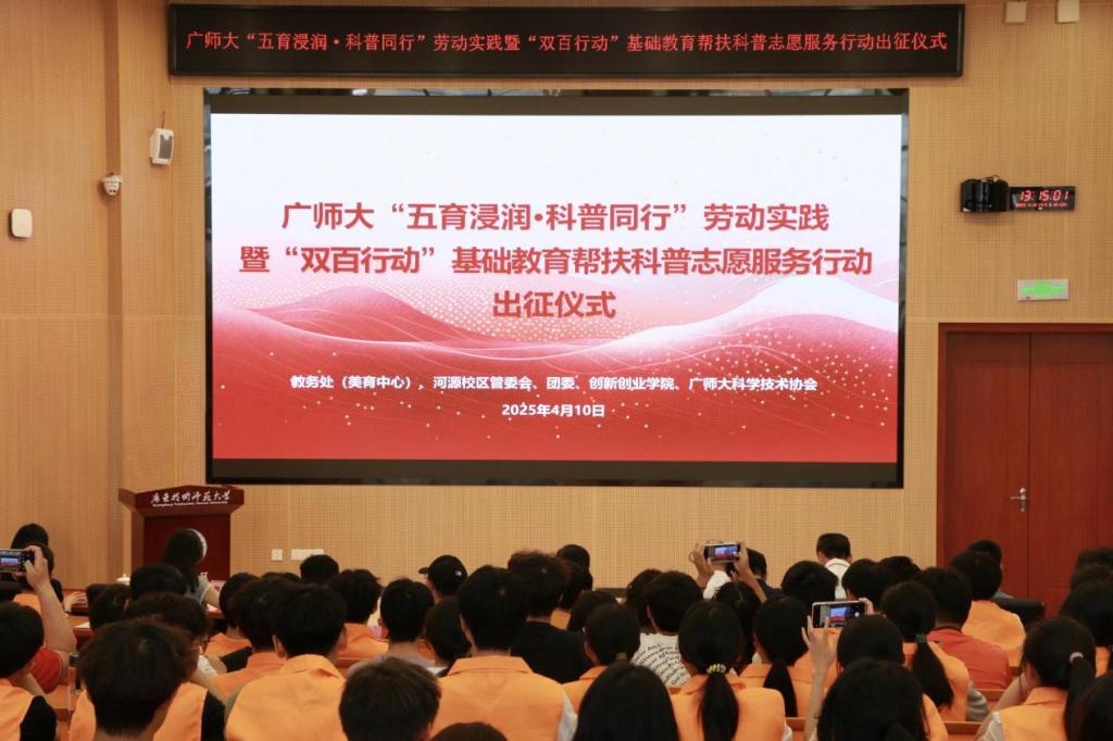当日下午的出征仪式在河源校区博学大讲堂105举行,来自11个二级学院的科普团队参与本次活动。基础教育学院郭新斌老师指导的“童趣智音探索者”团队,通过岗前志愿培训后,于当日下午前往对接学校。