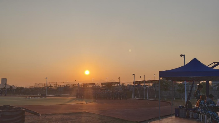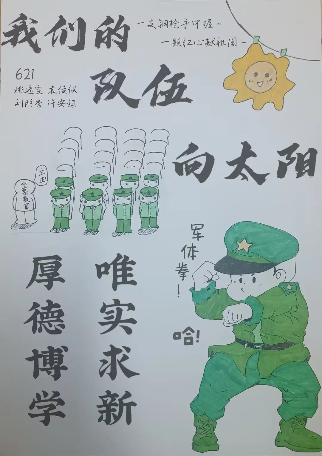 “在冬日的暖阳下,我们的脚步铿锵有力,军姿挺拔如松。我们在操场上挥洒汗水,用汗水书写青春的赞歌。”(四营一连三排 黄韦嘉,张益升,杨智豪,钟建鑫)