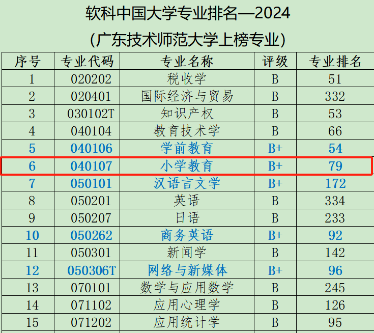 小学教育专业在成立不到1年的时间内,获得软科中国大学专业评级B+专业,广师大上榜专业共54个,其中A+专业1个,B+专业21个,B专业32个,小学教育专业成为学校上榜的21个B+专业之一。2024年4月,基础教育学院顺利通过新增学士学位授予专业审核,小学教育专业正式在广东省学位委员会备案。