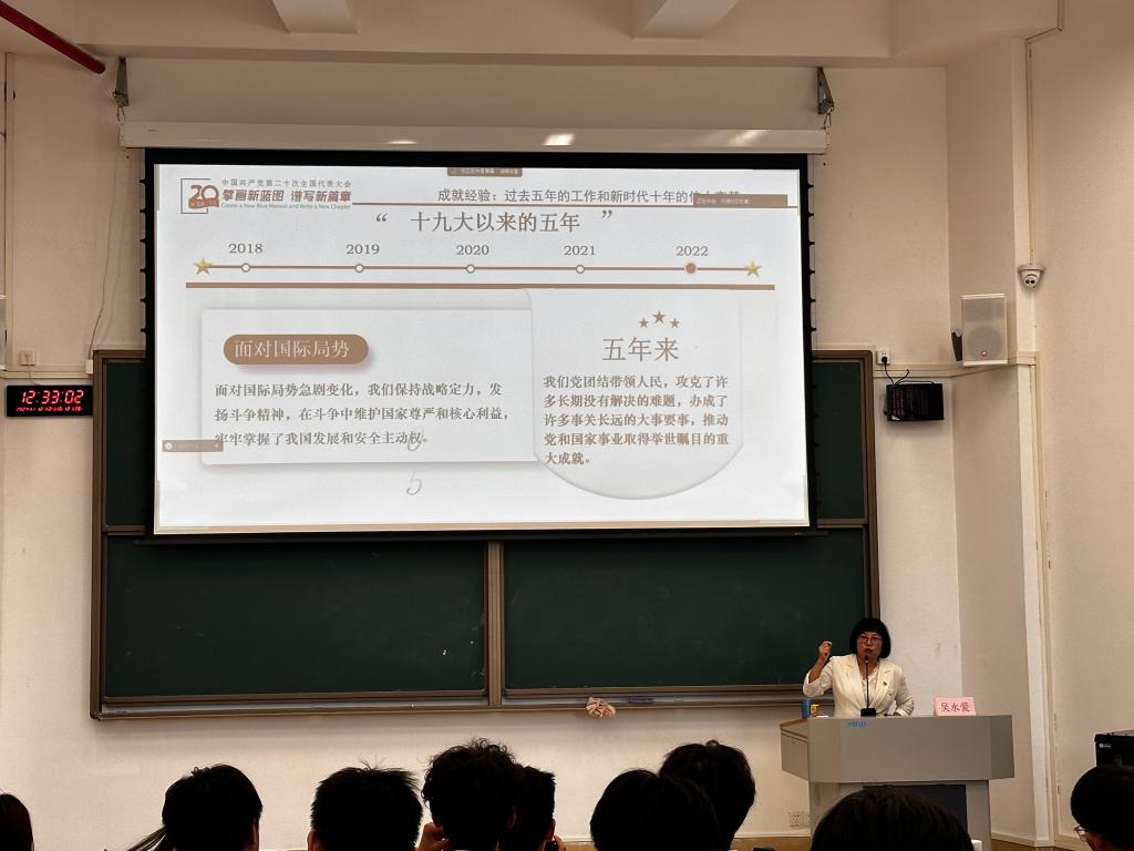 随后,吴书记围绕过去五年的工作和新时代十年的伟大变革介绍成就经验,并结合实际案例就指导思想、使命任务、战略部署等内容进行深入浅出的讲解,引导同学们进一步明确党员的责任与担当。
