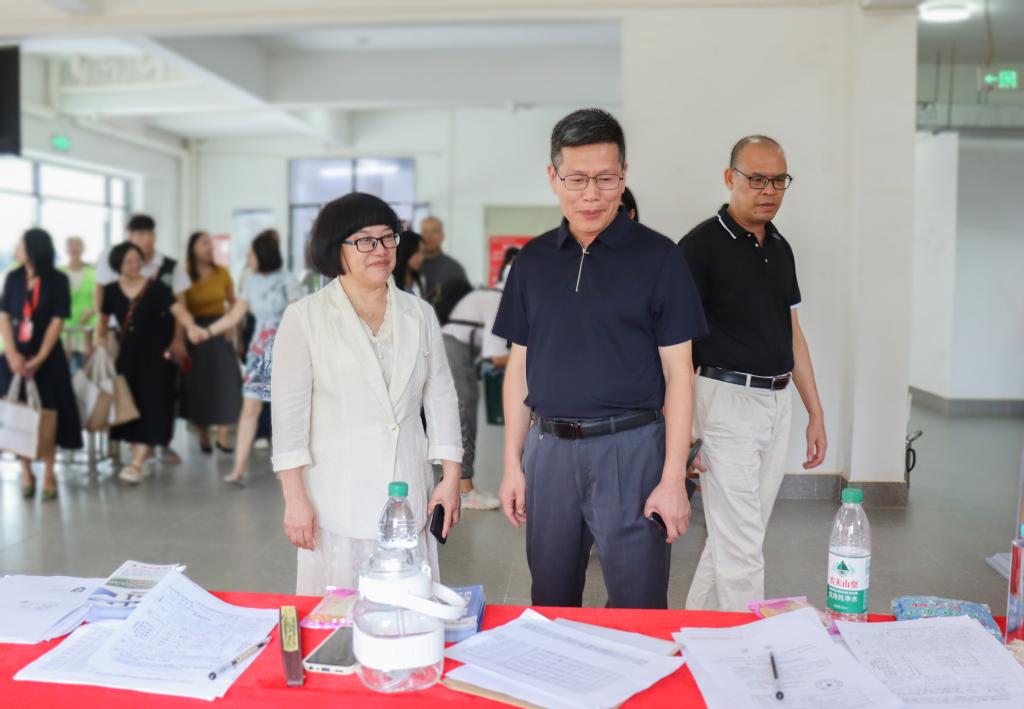 学校副校长苏晖(中)河源校区党委书记罗君辉(右)莅临基础教育学院迎新大本营,基础教育学院吴水爱书记(左)陪同
