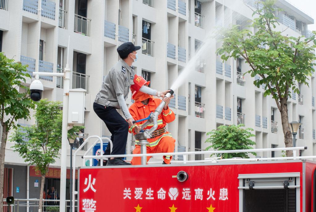 随着河源校区北苑5栋和北苑7栋某宿舍内起火,烟雾升起,演练正式开始。演练模拟宿舍发生火情,相关人员立即启动“快确认、快调集、快启动、快疏散”处置规程,在专业力量的协同配合下成功将火“扑灭”。
