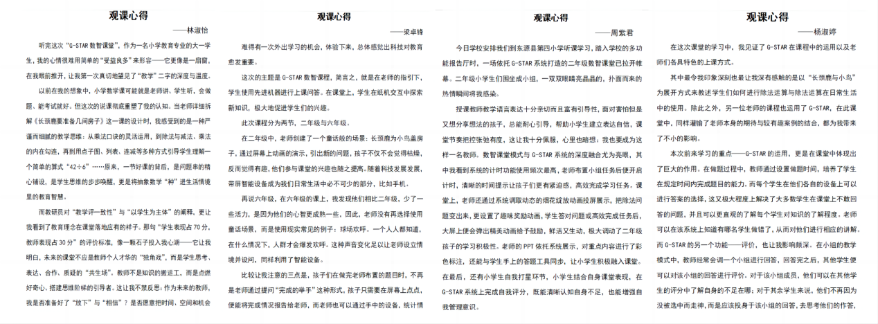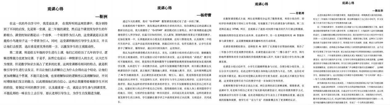 此次观课活动为我院学生提供了宝贵的现场学习平台。同学们在课堂记录、环节分析和课后讨论中,不断对比、反思,逐步构建对优质课堂的认知框架。活动结束后,2025级本科生结合所见所感,认真撰写心得体会,进一步内化观摩所得,明确自身在教学技能与课堂设计方面的提升路径。