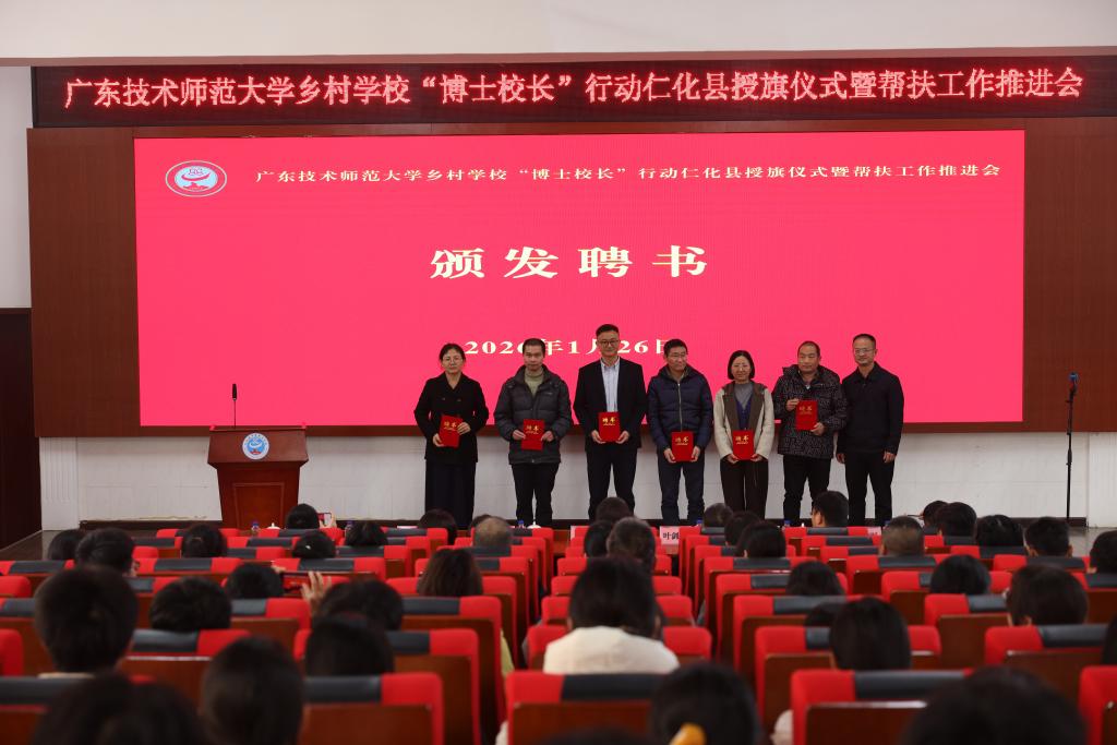 会上,金义富校长为乡村学校“博士校长”行动向仁化县教育局局长邓伟强授旗,邓伟强局长为6位“博士校长”颁发了聘书。
