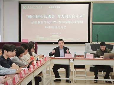 为深入贯彻立德树人根本任务,扎实推进教育教学高质量发展,3月1日,基础教育学院在厚德楼602教室召开“师生同心话成长 育人同行向未来”——2025-2026学年春季学期师生座谈交流会。学院院长熊华军、副院长杨定玉、办公室主任常锋峰,以及全体辅导员、专业教师与本科生、研究生代表齐聚一堂,采用圆桌座谈形式,围绕学业发展、教学管理、育人协同等话题坦诚交流、凝聚共识,共商成长良策,汇聚育人合力。